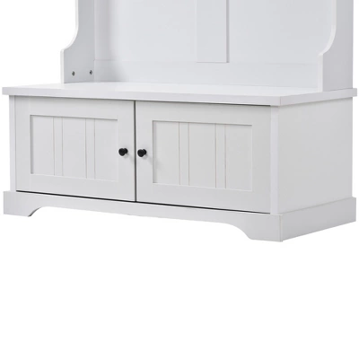 The entryway is the first thing people see when they step into your home. Far too often, this space becomes a mess of clothing and other items. This hall tree’s sleek design fits in with all decors and provides the essential storage space you need. Crafted from solid and manufactured wood, its hutch offers two cubbies and 4 hooks, perfect for tucking away coats, hats, gloves, and other outdoor wear, at the same time the bench features a double door that opens to reveals even more storage space while lending you a seat to pull on your boots. Keep it neat and organized with this hall tree!