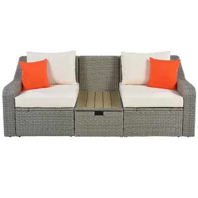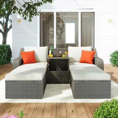 - [Perfect and Elegant Suit Design] This stylish rattan set has a rectangular coffee table with a lifting tabletop made of plastic wood for shelving items and it can support any sort of cup or cellphone and something else like that. With two ottomans, it is suitable for 2-4 people. Create a new vision for your balcony, garden, backyard, or poolside.