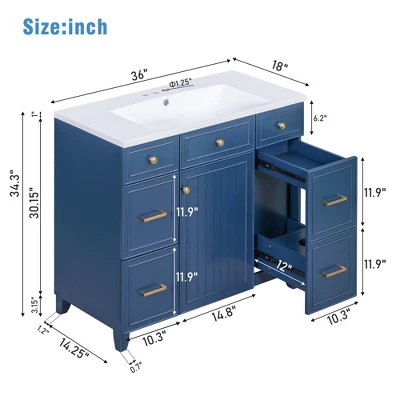 This classic navy blue bathroom vanity has spacious and versatile storage space to easily store everything your bathroom needs. The navy blue finish with gold brushed copper pulls will give your bathroom vanity a high-end look, classic and timeless, adding value to your home.