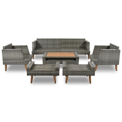 This sofa set is composed of solid wood legs and desktop, hand-woven rattan, and polyester fabric. Includes 1 double seat, 2 single sofas, 2 ottomans, and 1 table. All parts have free positions and distances according to your needs, suitable for simple rest and business conversation. Warm light beige/brown rattan and pillows are also a high-end collocation of the same color. It can be placed in your garden, backyard, poolside and other places. Seating 6 people, it’s the perfect setting to host a party or lounge with the family. And those cushions are made of Sun Umbrella fabric that is waterproof, UV-proof, and corrosion-proof for many years to use. They only need a rag to keep them clean and tidy. While those pillows are equipped with zippers and only need a simple cleaning.