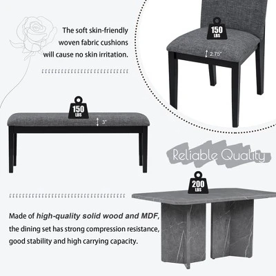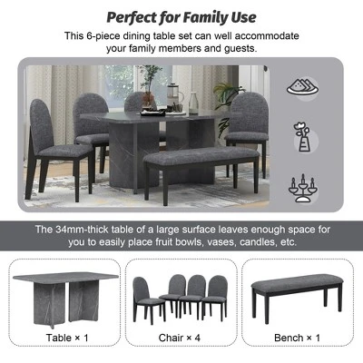 This 6-piece dining table set contains 1 dining table, 4 matching chairs, and 1 bench. It can seat 6 people and can well accommodate your family members and guests. Having a large surface, the 1.3″ thick table leaves enough space for you to advantageously place fruit bowls, vases, candles, etc., and it won’t be crowded. With the appearance of natural marble, the faux marble sticker-covered table highlights the beautiful and natural texture. Refreshingly austere and simple in design, this dining set embodies the modern and minimalist style, which can add a touch of elegance to your dining room, kitchen area, or home bistro.