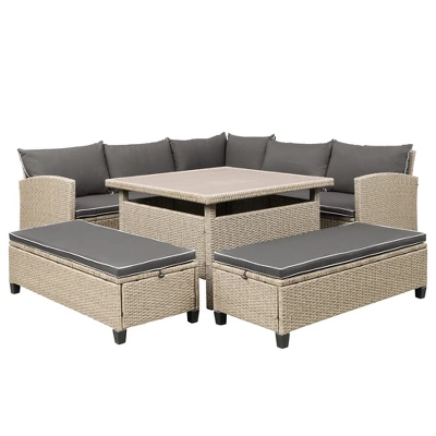 With two loveseats, a corner sofa, two benches and a large table, this patio sectional sofa set can accommodate multiple people and has everything you need for gatherings with family and friends. Made of all-weather wicker and sturdy construction, it’s stable and durable enough to last you for years.