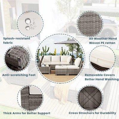 To enjoy your time on the patio with either friends or family, a patio sofa will always be needed. High-density and soft cushions and pillows provide you with strong lumbar support for better comfort and relaxation. Ergonomic armrests and spacious seating space allow your back and arms to lean and stretch naturally. Coming with 2 corner chairs, 2 single chairs, 1 ottoman, and 1 storage table, this conversational sofa set makes it easy to flexible with numerous arrangement options. You can adjust each item at any time according to your preference and the geography of the patio, porch, backyard, balcony, poolside, and garden.