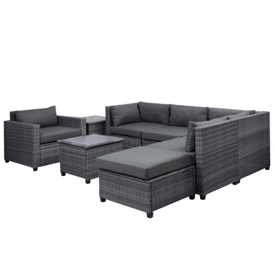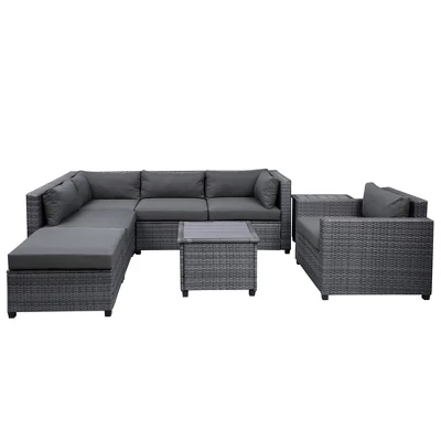 Turn your backyard into an outdoor getaway with our 8-Piece Wicker Patio Set. Designed with versatility in mind, each set comes with a 2 seater sofa, lounge sofa, coffee table, and side sofa chair. Instantly create a cohesive sectional by simply pushing the 2 seater sofa and lounge sofa together, or separate them if you want your patio set to cover a larger area of space. Crafted with thick woven rattan wicker weaving reinforced with rust-resistant steel, this patio set is resistant to water, cracking, splitting, and sun rays so it can last you and your family for years to come. Lean back and relax for hours on end with the thick high-density foam cushions upholstered in soft fabric covers that are formulated for easy spot cleaning, while the spacious design comfortably sits 5-6 people for plenty of room for your family and guests. This patio set is the perfect addition to backyards, patios, poolside, gardens, and any other outdoor spot that needs a little polishing up.