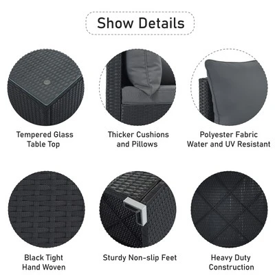 - [Handcrafted Rattan] The hand-woven rattan is durable, and UV resistant with a natural look but is made of resin. The wicker sofa set features high-quality gray rattan hand woven in a stylish pattern over a durable powder-coated steel frame.