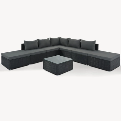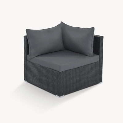 This wicker sofa set is made of a sturdy iron frame and top quality wicker, including 1 corner sofa, 4 single sofas, 2 ottomans, and 1 coffee table. Black hand-woven wicker with the comfortable look and texture of natural wicker, thicker cushions, and pillows for your ultimate enjoyment, safe and tough tempered glass, they all have high UV resistance and water resistance for years of use. Gray/beige cushions and black wicker for a sense of luxury. Freestanding sofas can be freely combined into different positions and distances according to your style. It can be placed in your garden, backyard, poolside and other places. Seating 5-7 people, it is the best choice for outdoor places.
