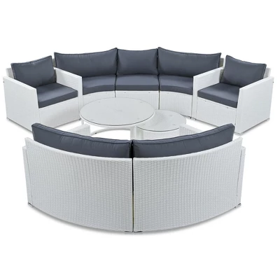 - [Durable Construction] Built with high-quality wicker material and steel parts, the Half-moon Wicker Sofa Set is sturdy and durable while coming with ultra-soft pillows and cushions for added comfort.