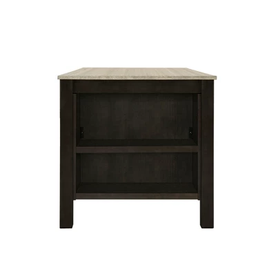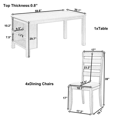 Wow friends or your family with this 5-piece dining table set. Constructed with solid rubberwood legs and premium MDF, this kit combines stability with practicality together. Built with 2-tier side shelves, this dining table can be always organized without sacrificing style to save space. Featured simple clean lines and classical farmhouse style as well as extra storage space and distressed color which will make this dining set a great addition to any home.Table Overall Dimension: 59.8”W x 30.1″D x 29.7″D;Tabletop thickness: 0.8″; Storage Shelf thickness: 1.2″; Storage Shelf depth: 9.5″;Storage Shelf height: 7.5″/10.2″; Chair Overall Dimension: 18.1″W x 18.1″D x 39″ H; Seat depth: 16.5″; Seat height: 17″; Back height: 23.2″.