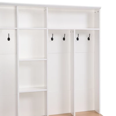 - 【Spacious Storage Space】The hall tree has an impressive storage capacity, with five large cube storage spaces under the seats and a variety of open shelves to accommodate items of various sizes. The eight hooks above are perfect for storing your coats, hats and bags, keeping the hallway tidy.