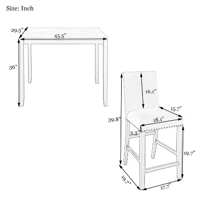 Table Dimension: 45.5″ W x 29.5″ D x 36″ H; Chair: 18.1″ W x 19.7″ D x 39.8″ H.