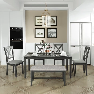 This Rectangular dining table set gives 4 wooden dining chairs, 1 dining table and 1 fabulous dining bench which can fully accommodate your family. Offer a touch of elegance to your dining area with our wooden dining table set.The rectangular table is made of high quality MDF veneer pine while the decorated wooden strips at the edges of both chairs and tabletop help to enhance the solid, traditional feel. This dining set frame and legs are crafted of premium quality rubber real wood to provide fantastic durability and stability. They feature an “X”-shaped curved backrest, burlap cushions and cone-shaped legs, provide maximum comfort and relaxation for your back.